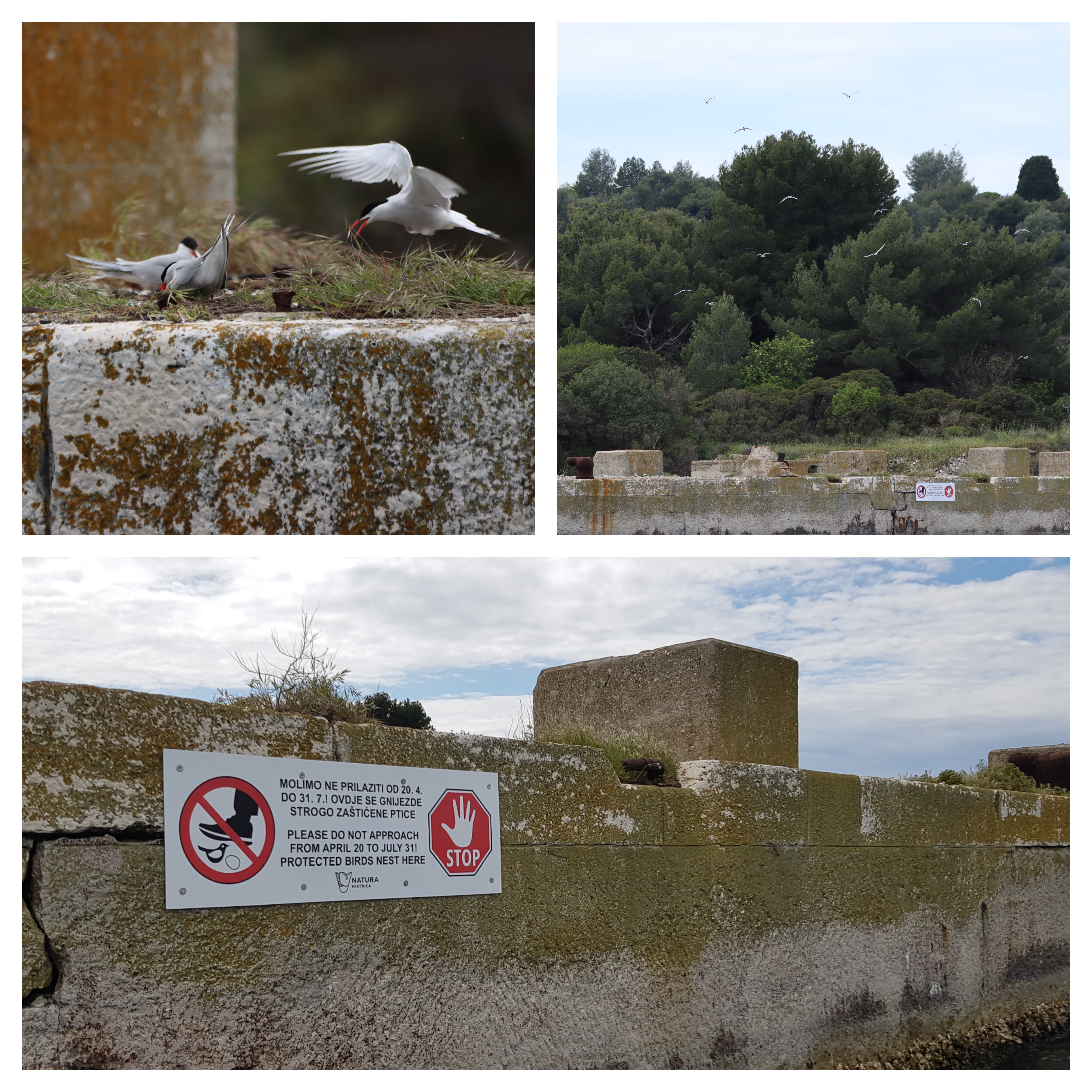U ožujku smo obišli Pulski zaljev i molove, zabilježili nekoliko odraslih čigri i pronašli stara gnijezda, odnosno vrlo blago uzvišene nakupine šljunka, grančica i komadića željeza s ponekim ostatkom hranjenja. U dogovoru s kolegama iz Zavoda za ornitologiju HAZU i ostalim ornitolozima koji su provodili aktivnosti s crvenokljunim čigrama, odlučeno je da se kolonija označi informativnom pločom kojom molimo posjetitelje da ne prilaze molovima i na taj način omogući nesmetano gniježđenje crvenokljunim čigrama. Osim toga dogovoreno je da minimalno interveniramo u kvalitetu ovog zamjenskog „urbanog“ staništa pa smo zato donijeli nekoliko kanti oblutaka te ovom prilikom zahvaljujemo Općini Medulin na toj donaciji!