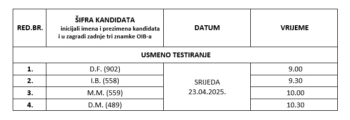 Obavještavaju se kandidati, koji su podnijeli pravovremenu i cjelovitu prijavu te koji zadovoljavaju sve formalne uvjete tražene u oglasu, da će se prethodna provjera znanja i sposobnosti kandidata (usmeno testiranje), održati u srijedu 23. travnja 2025. g., prema sljedećem rasporedu: