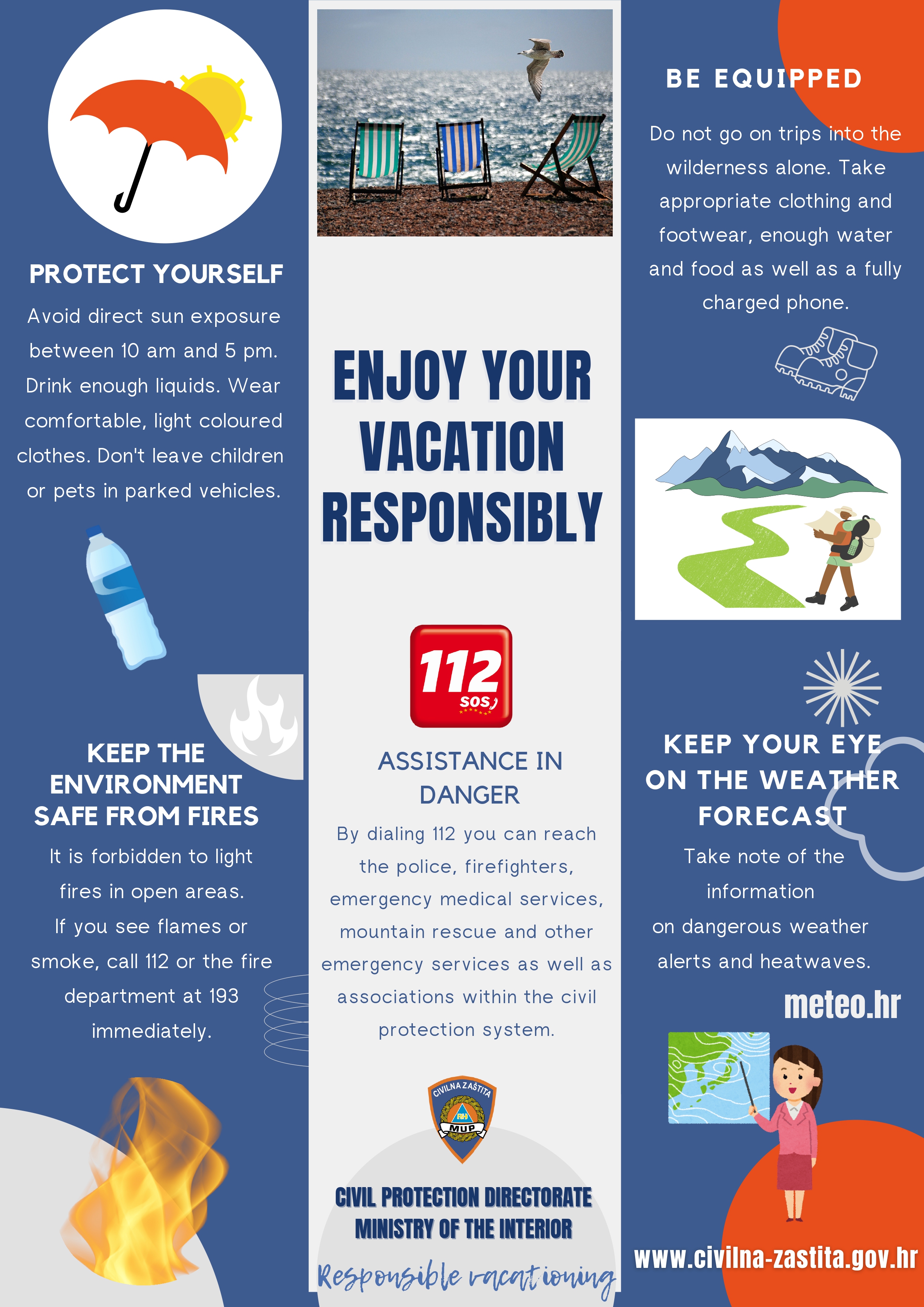U namjeri što boljeg preventivnog informiranja građana i turista o odgovornom ponašanju te pravilnim reakcijama u ljetnom razdoblju, Ravnateljstvo civilne zaštite i ove godine nastavlja s kampanjom „ODGOVORNO LJETOVANJE“. Prenosimo informativni plakat „ODGOVORNO LJETOVANJE“, na hrvatskom i engleskom jeziku.