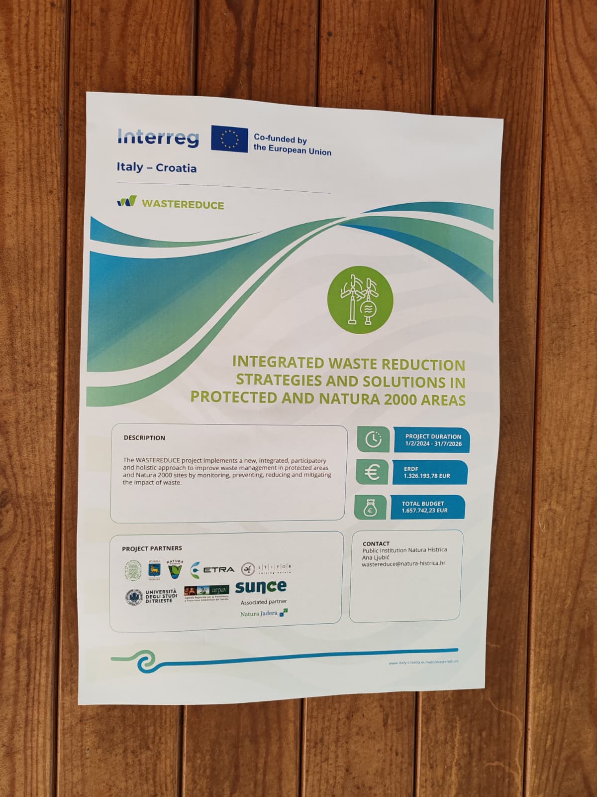 Projekt WASTEREDUCE ima za cilj poboljšati upravljanje otpadom u zaštićenim i Natura 2000 područjima korištenjem krajobraznog pristupa za praćenje, sprječavanje i ublažavanje utjecaja otpada. Poseban naglasak stavljen je na inovativna rješenja i digitalne alate koji doprinose cirkularnom gospodarstvu i održivosti upravljanja otpadom. Ukupno trajanje projekta je od 1. veljače 2024. do 31. srpnja 2026. godine, a ukupni proračun iznosi 1.657.742,00 eura. Vrijednost aktivnosti koje provodi JU Natura Histrica iznosi 208.600 eura. Projekt je sufinanciran iz Europskog fonda za regionalni razvoj (EFRR) (80%) u okviru Programa Interreg VI-A Italija–Hrvatska 2021.–2027. Vodeći partner projekta je Institut za poljoprivredu i turizam (IPTPO), a partneri su: Istarska županija, JU Natura Histrica, Udruga Sunce Split, University of Trieste, ETRA S.p.A. Società Benefit i ETIFOR Srl Società Benefit.